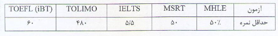 ۵-۱-۳- برای اعزام به فرصت تحقیقاتی در کشورهای انگلیسی زبان ارائه گواهی معتبر زبان انگلیسی و کسب حداقل نمره مطابق جدول زیر در یکی از آزمون‌های TOEFL iBT ،TOLIMO ،IELTS ،MSRT،  (صرفاً برای دانشجویان گروه پزشکی) MHLE از سوی دانشجو الزامی است. برای اعزام به فرصت تحقیقاتی کشورهای غیر انگلیسی زبان ارائه گواهی معتبر زبان انگلیسی و کسب حداقل نمره مطابق جدول زیر یا ارائه گواهی معتبر مبنی بر تسلط به زبان رسمی آن کشور یا برگزاری آزمون (اعم از شفاهی یا کتبی) و احراز بسندگی زبان آن کشور توسط اداره کل الزامی است.