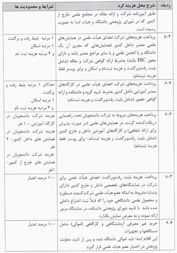 محل‌های هزینه‌کرد پژوهانه اعطایی بر اساس جدول زیر می‌باشد. شایان ذکر است که درصدهای مشخص‌شده در ستون سمت چپ برای هزینه‌کرد از اعتبار کل خواهد بود.