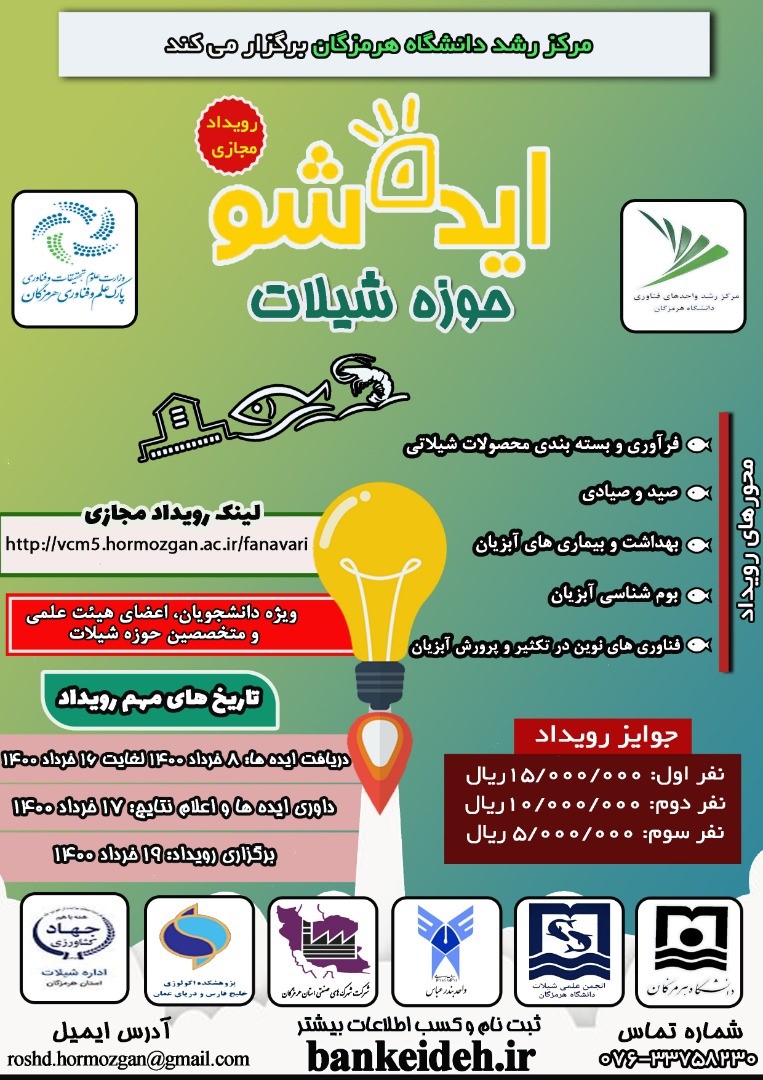 برای محقق نمودن این مهم مرکز رشد دانشگاه با همکاری پارک علم و فناوری استان هرمزگان، شرکت شهرک های صنعتی، اداره کل شیلات هرمزگان، انجمن علمی شیلات دانشگاه هرمزگان، پژوهشکده اکولوژی خلیج فارس و دانشگاه آزاد اسلامی واحد بندرعباس در راستای حمایت از طرح ها و ایده های فناورانه مسابقه ای در قالب ایده شو در حوزه شیلات را برنامه ریزی و برگزار نمودند.
