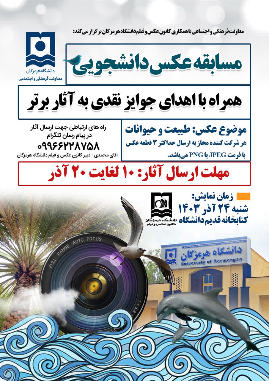 معاونت فرهنگی و اجتماعی با همکاری کانون عکس و فیلم دانشگاه هرمزگان برگزار می‌کند: