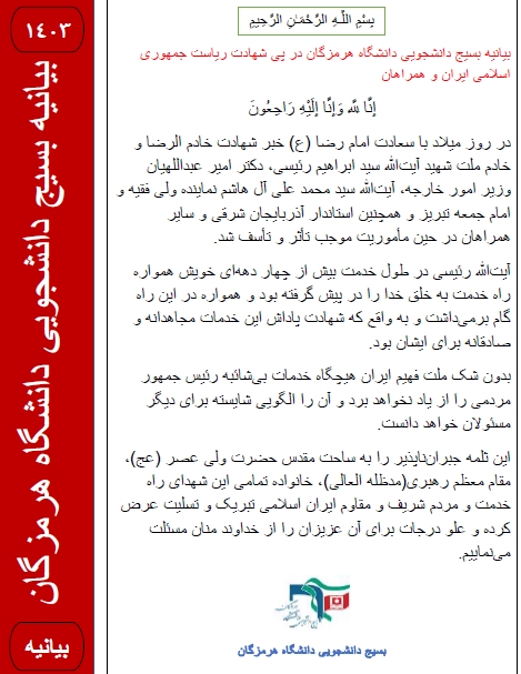 بیانیه بسیج دانشجویی دانشگاه هرمزگان در پی شهادت ریاست جمهوری اسلامی ایران و همراهان: