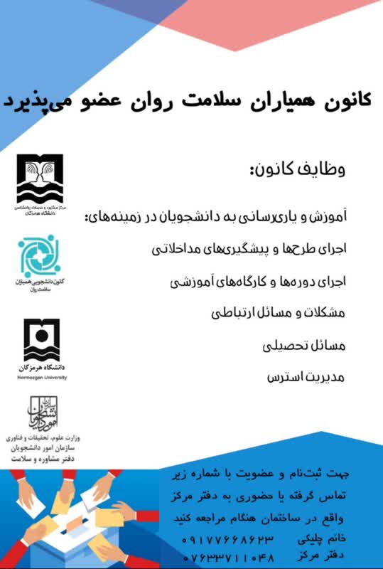 🗳️انتخابات کانون همیاران سلامت دانشگاه هرمزگان روز دوشنبه ۱۹ آبان‌ماه ۱۴۰۴ با حضور جناب آقای دکتر هادی سلیمی (رئیس مرکز مشاوره، سلامت و سبک زندگی) به‌صورت حضوری در سالن همیاران مرکز مشاوره دانشگاه هرمزگان برگزار گردید.