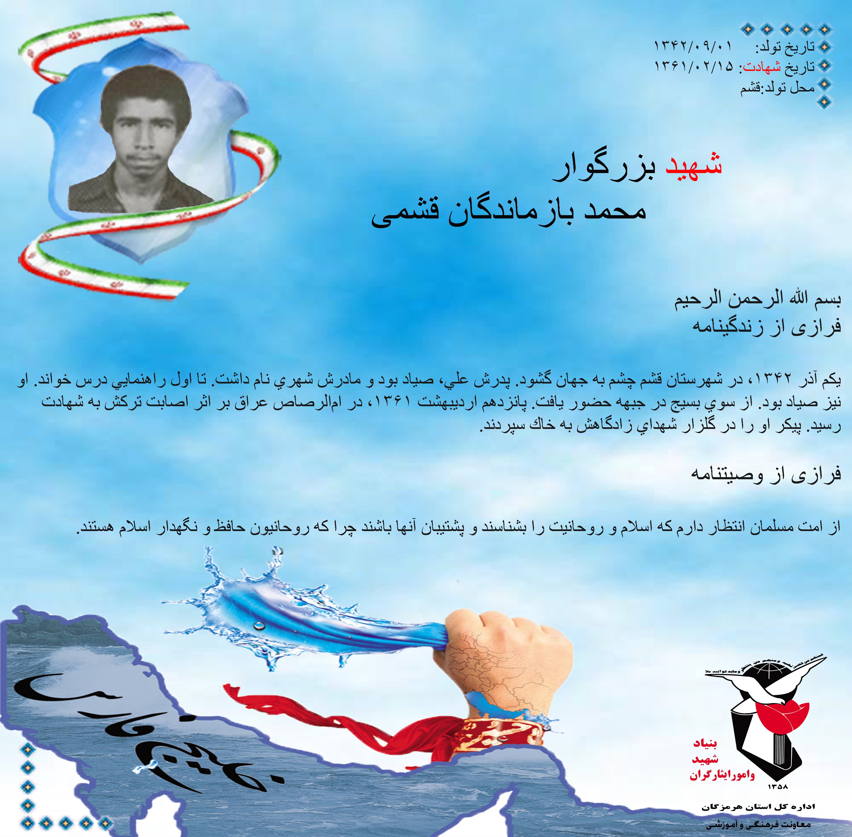 فرازی از زندگینامه و وصیتنامه شهید بزرگوار محمد بازماندگان قشمی