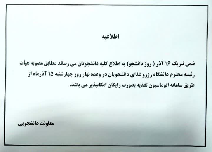 به اطلاع کلیه دانشجویان محترم می رساند جهت رزرو نهار رایگان روز چهارشنبه 15 آذرماه به سامانه اتوماسیون تغذیه مراجعه نمایند.