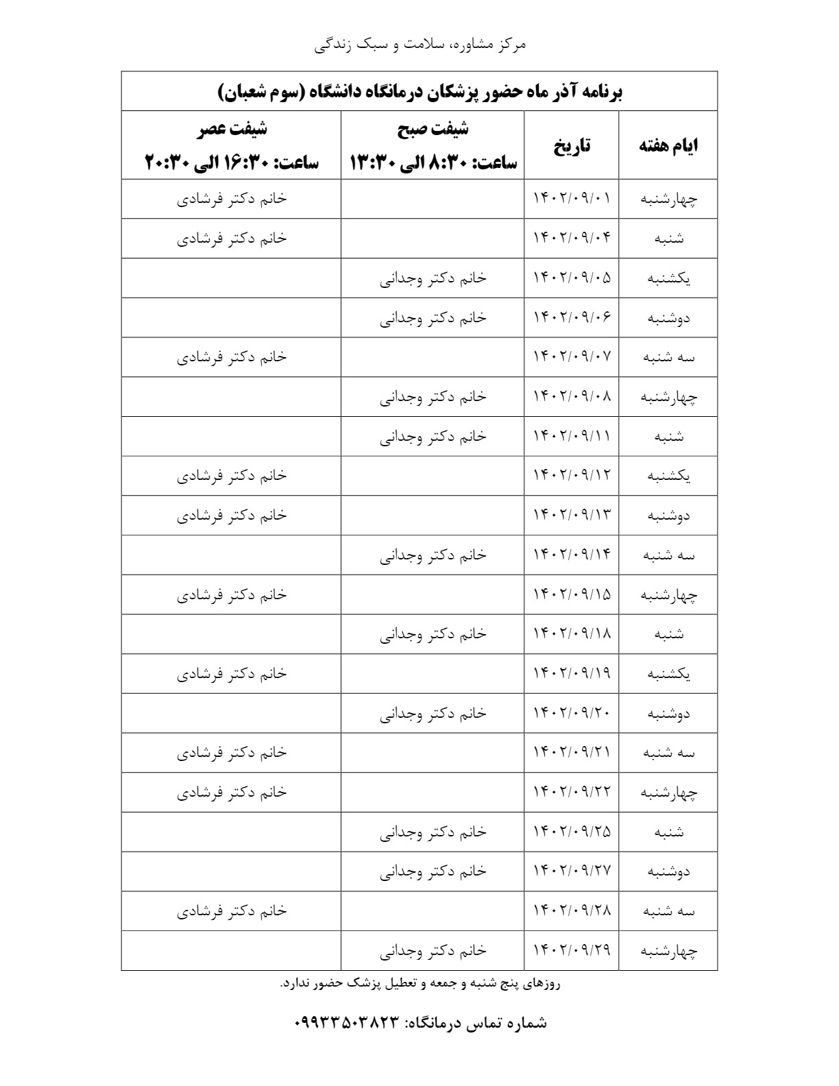 برنامه حضور پزشکان درمانگاه (سوم شعبان) در ماه آذر