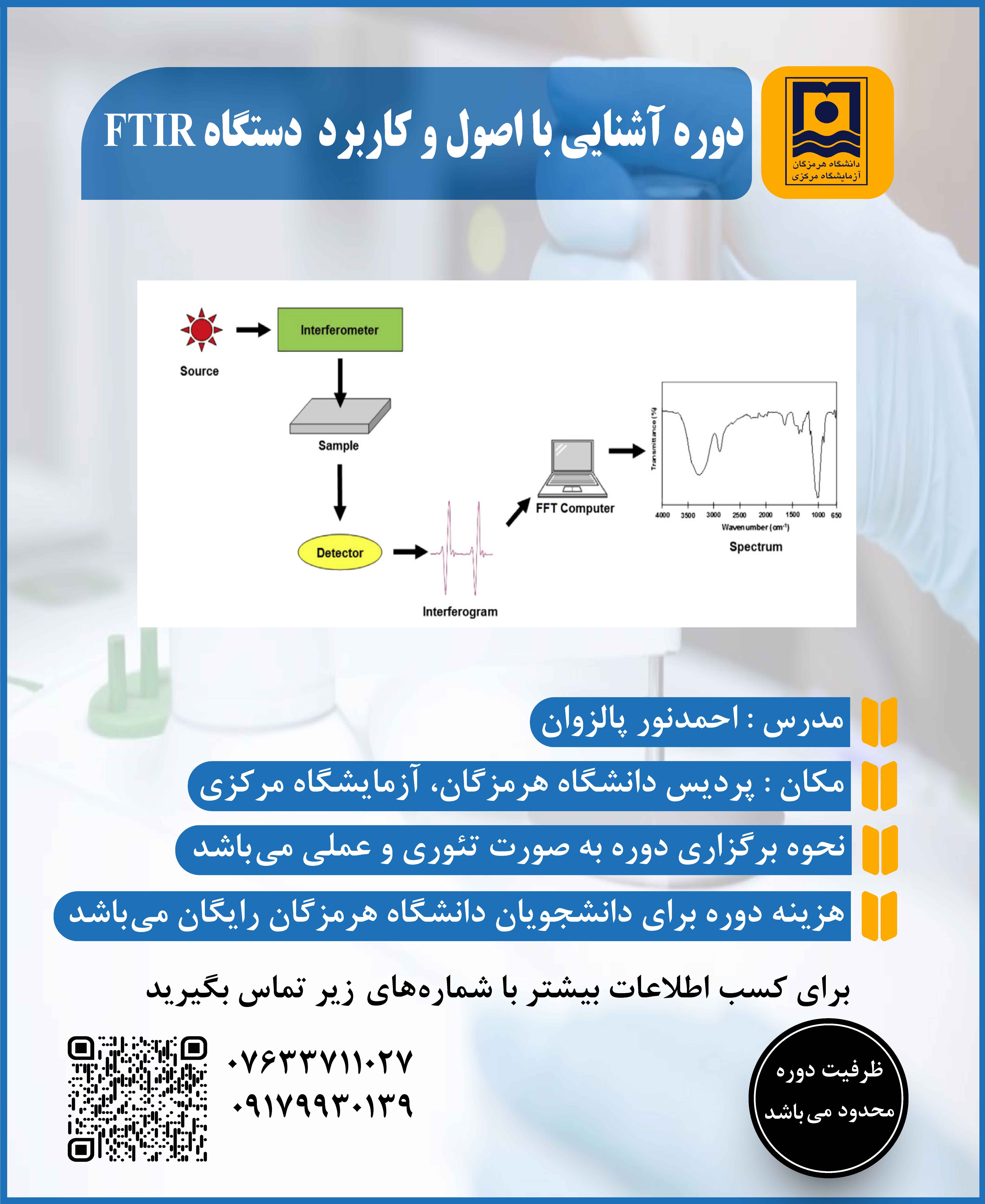 آزمایشگاه مرکزی در نظر دارد در راستای توانمندسازی دانشجویان، کارگاه آشنایی با اصول و کاربرد دستگاه FT-IR را برگزار کند.