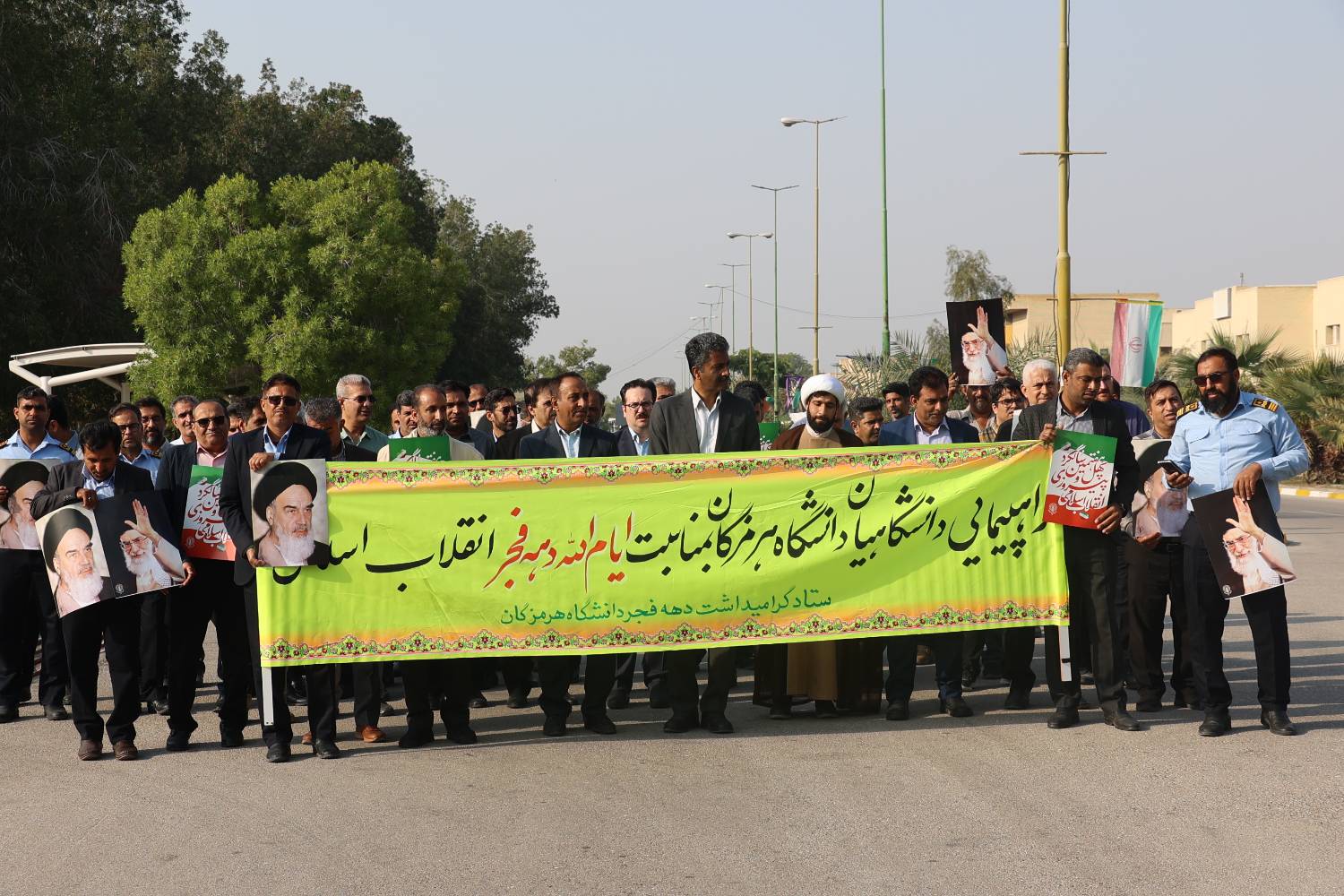 راهپیمایی به مناسبت فرارسیدن دهه مبارک فجر و سالروز پیروزی شکوهمند انقلاب اسلامی ایران، با حضور اعضای هیئترئیسه، اساتید وکارکنان دانشگاه برگزار شد. این مراسم با هدف گرامیداشت ایامالله دهه فجر، تجدید میثاق با آرمانهای والای انقلاب اسلامی و پاسداشت یاد و خاطره امام خمینی (ره) و شهداء برگزار گردید. شرکتکنندگان با حضور پرشور خود، ضمن سر دادن شعارهای انقلابی، بر پایبندی به ارزشهای انقلاب اسلامی و ادامه راه شهدا تأکید کردند.